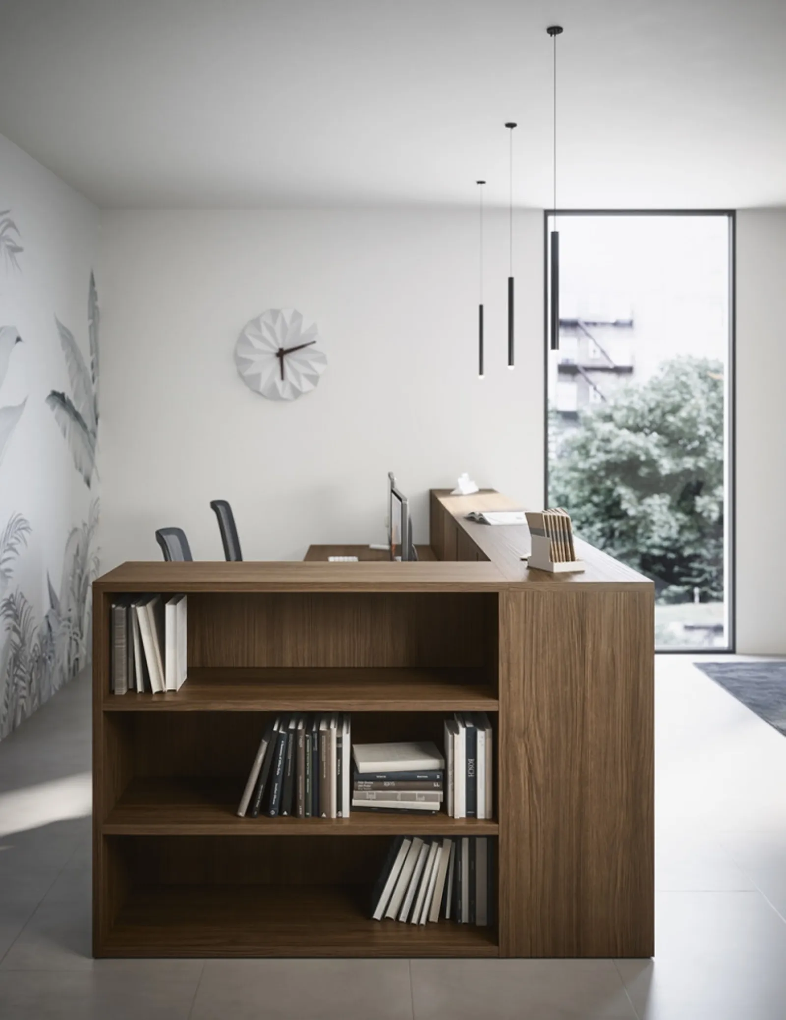 In showroom puoi vedere dal vivo le più originali soluzioni arredative di Arredo Ufficio in melaminico, sempre di ottima qualità e ideali per ambienti di ogni genere. Arredare attentamente l'ambiente lavorativo è di primo piano per assicurare la comodità per i lavoratori e l’accoglienza per i clienti: il nostro showroom ti aspetta. Entra a vedere nel nostro negozio molteplici modelli di banconi reception di grande qualità, sempre realizzati in materiali pregiati e resistenti negli anni. Bancone Reception 14B di Cinquanta3: è uno dei migliori esempi di arredi per gliambienti lavorativi pratici e belli da vedere del rinomato brand.